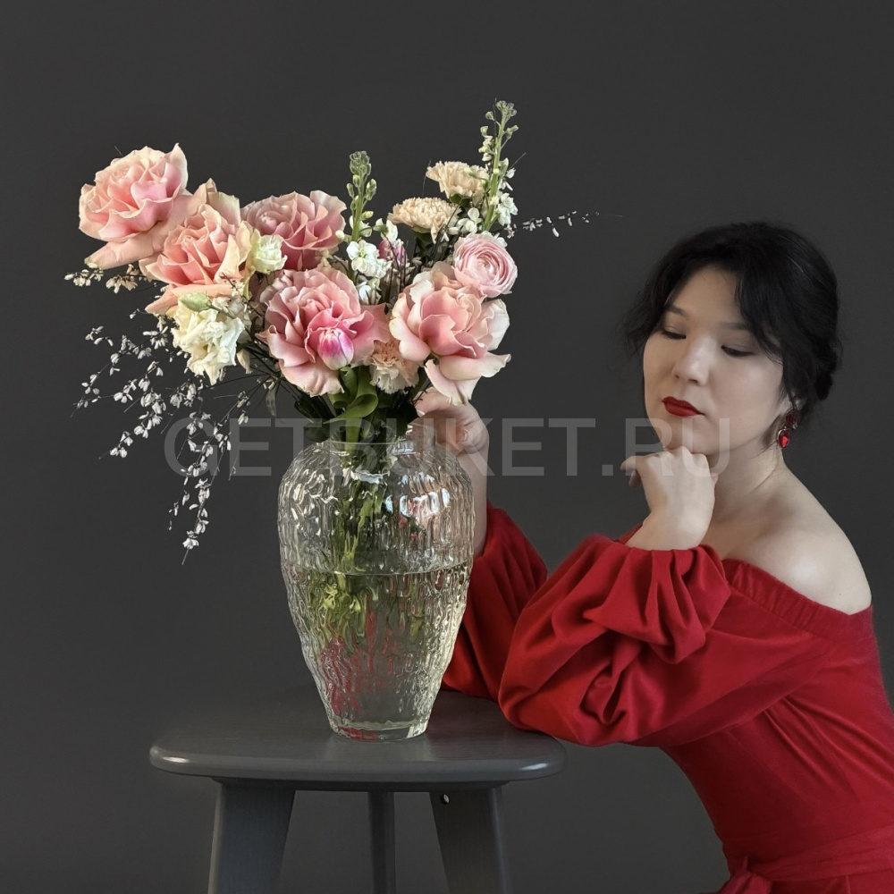Цветочная композиция из роз, генисты и ранункулюсов в вазе