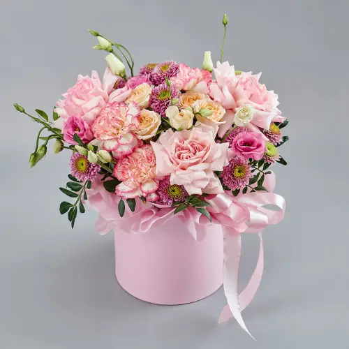 Цветочная композиция из роз, хризантем и гиперикума с краспедией в шляпной коробке7 330 ₽Цветочная композиция из роз, хризантем и гиперикума с краспедией в шляпной коробке 7 330 ₽ -