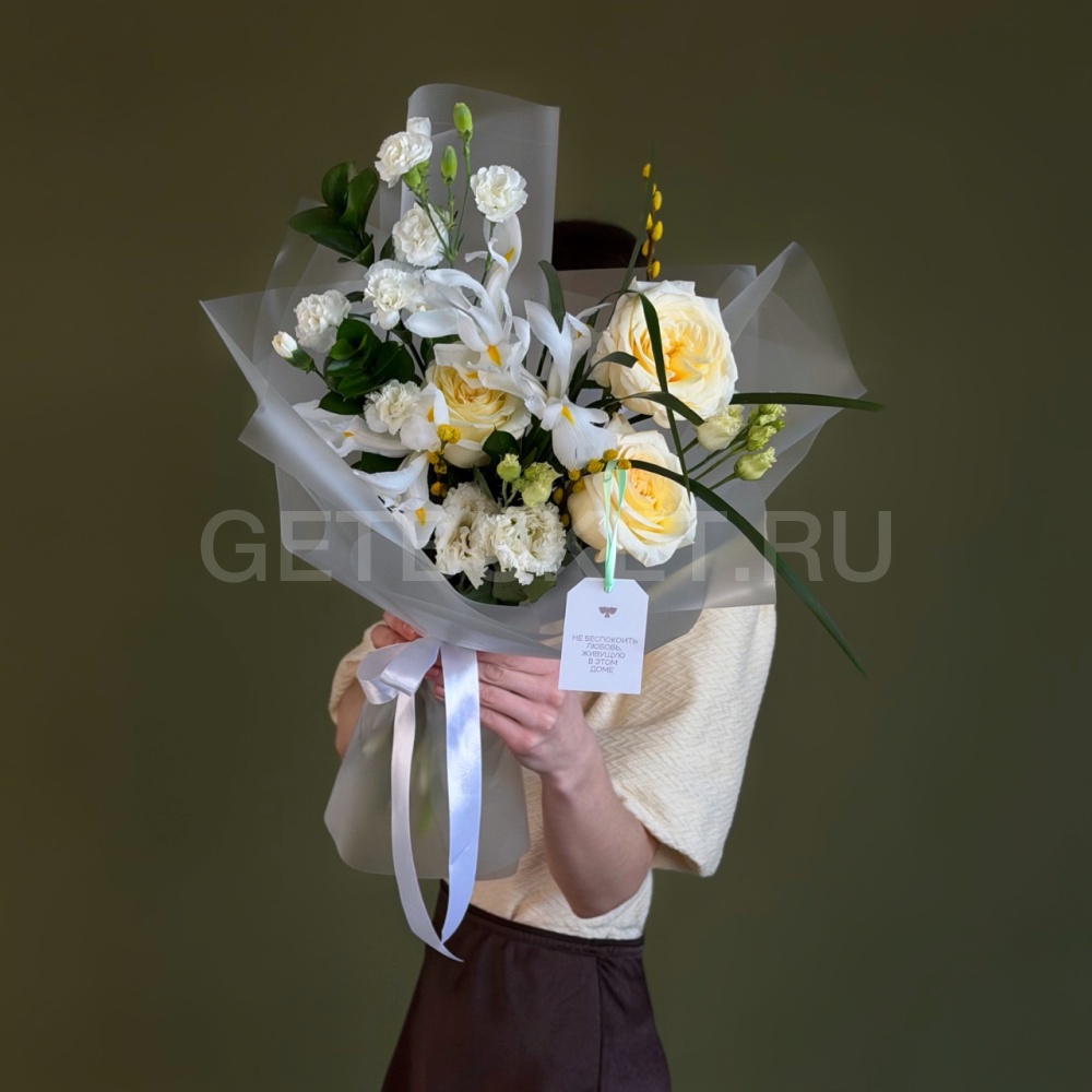 Букет из белых роз, гвоздик и эустомы8 900 ₽Букет из белых роз, гвоздик и эустомы 8 900 ₽ -