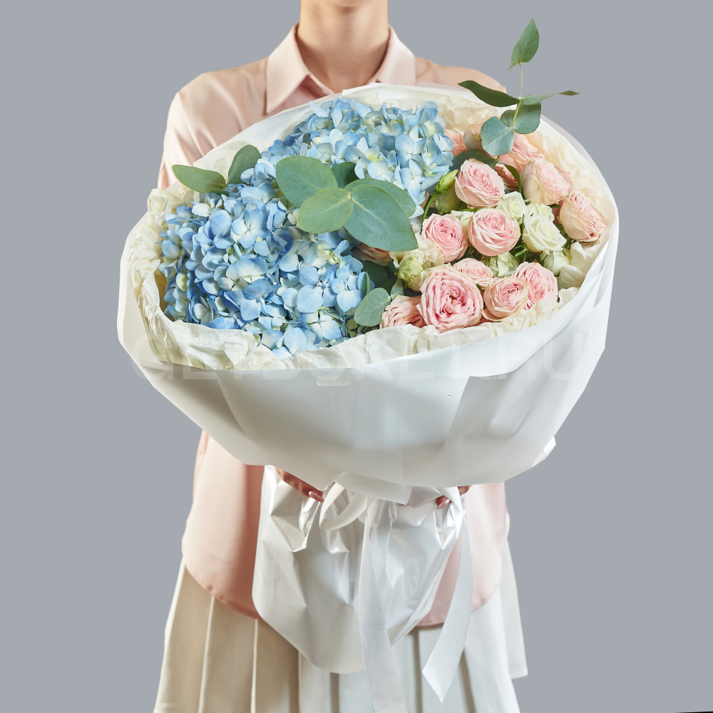 Букет с гортензией и кустовыми розами