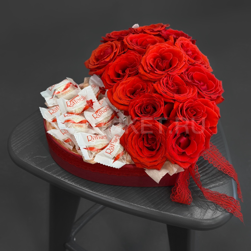 Цветочная композиция из роз с конфетами в виде сердца