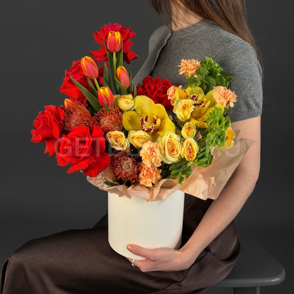Цветочная композиция из тюльпанов, кустовой розы и нутана в шляпной коробке