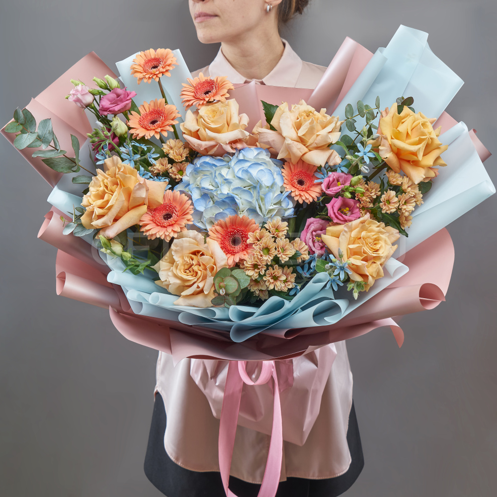 Букет персиковых роз, гортензии и хризантемы