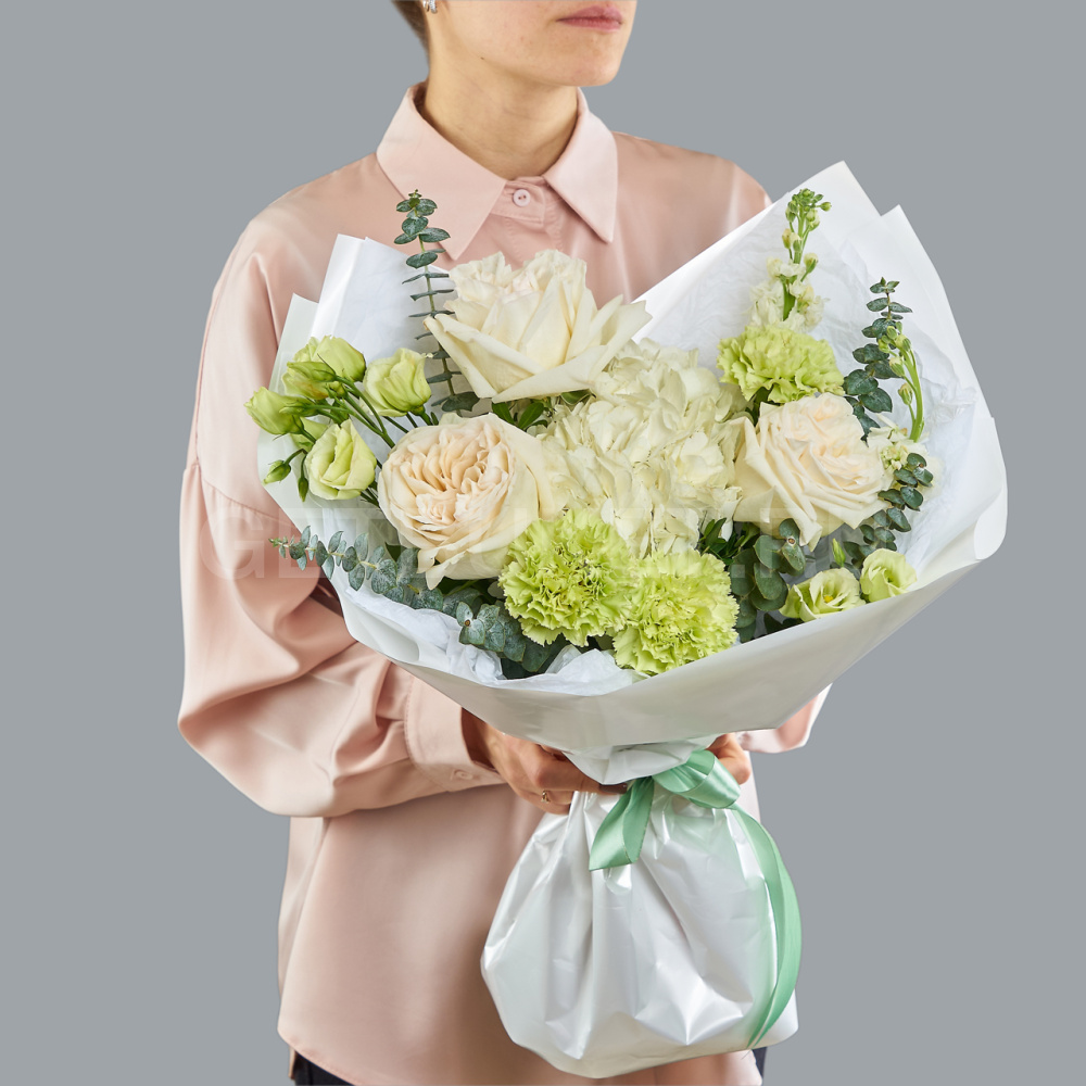 Букет белых роз, гортензии и зеленой гвоздики с эустомой
