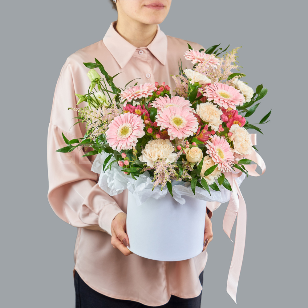 Цветочная композиция из розовых гербер, гвоздик и астильбе с гиперикумом в шляпной коробке