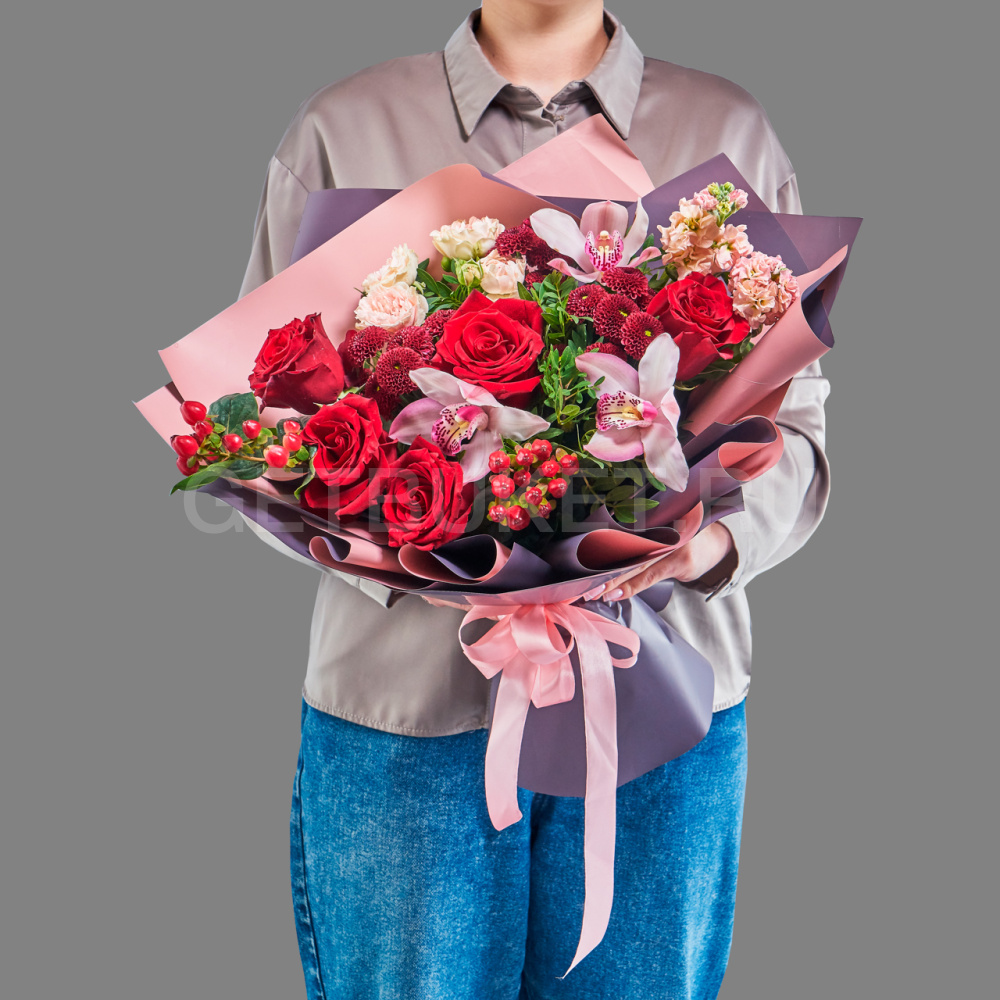 Букет из розовых гвоздик, роз и альстромерий2 710 ₽Букет из розовых гвоздик, роз и альстромерий 2 710 ₽ -