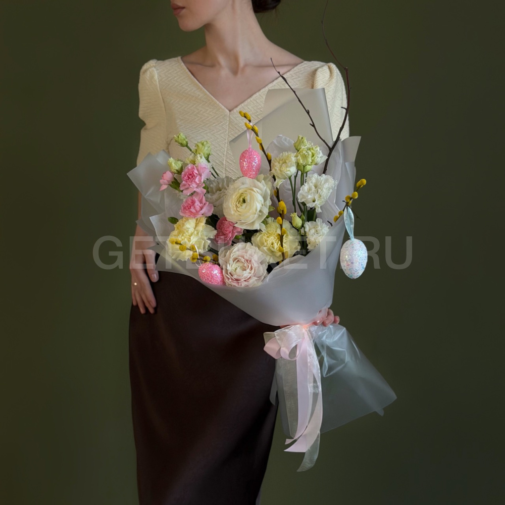 Пасхальный букет из гвоздик, кустовых роз и гербер с вербой3 900 ₽Пасхальный букет из гвоздик, кустовых роз и гербер с вербой 3 900 ₽ -
