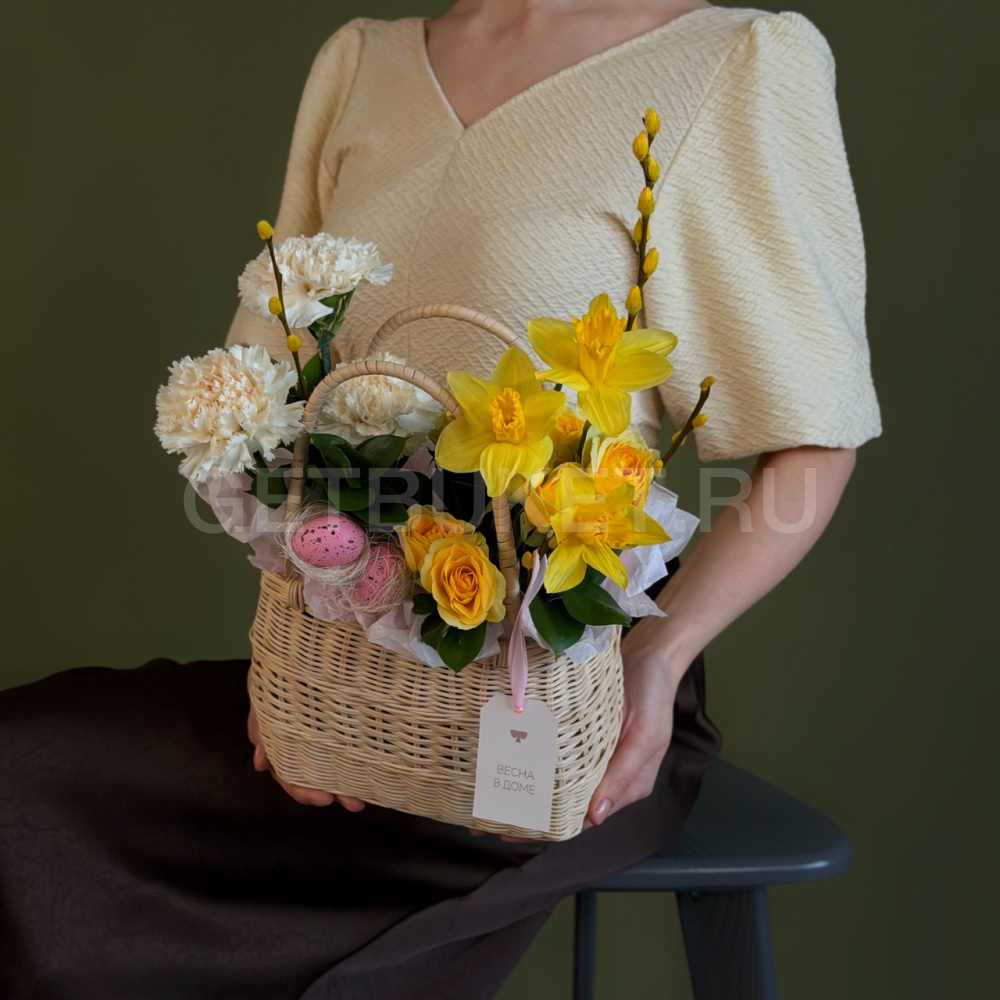 Цветочная композиция с гвоздиками, нарциссами и вербой в плетеной корзине