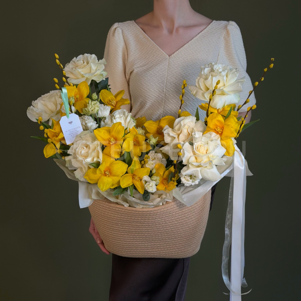 Цветочная композиция с гвоздиками, нарциссами и вербой в плетеной корзине3 900 ₽Цветочная композиция с гвоздиками, нарциссами и вербой в плетеной корзине 3 900 ₽ -