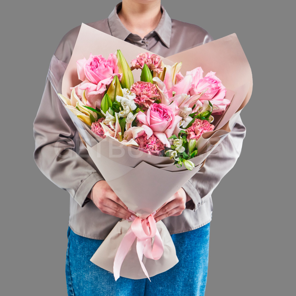 Нежный букет из розовых роз, белых гвоздик и альстромерии3 880 ₽Нежный букет из розовых роз, белых гвоздик и альстромерии 3 880 ₽ -