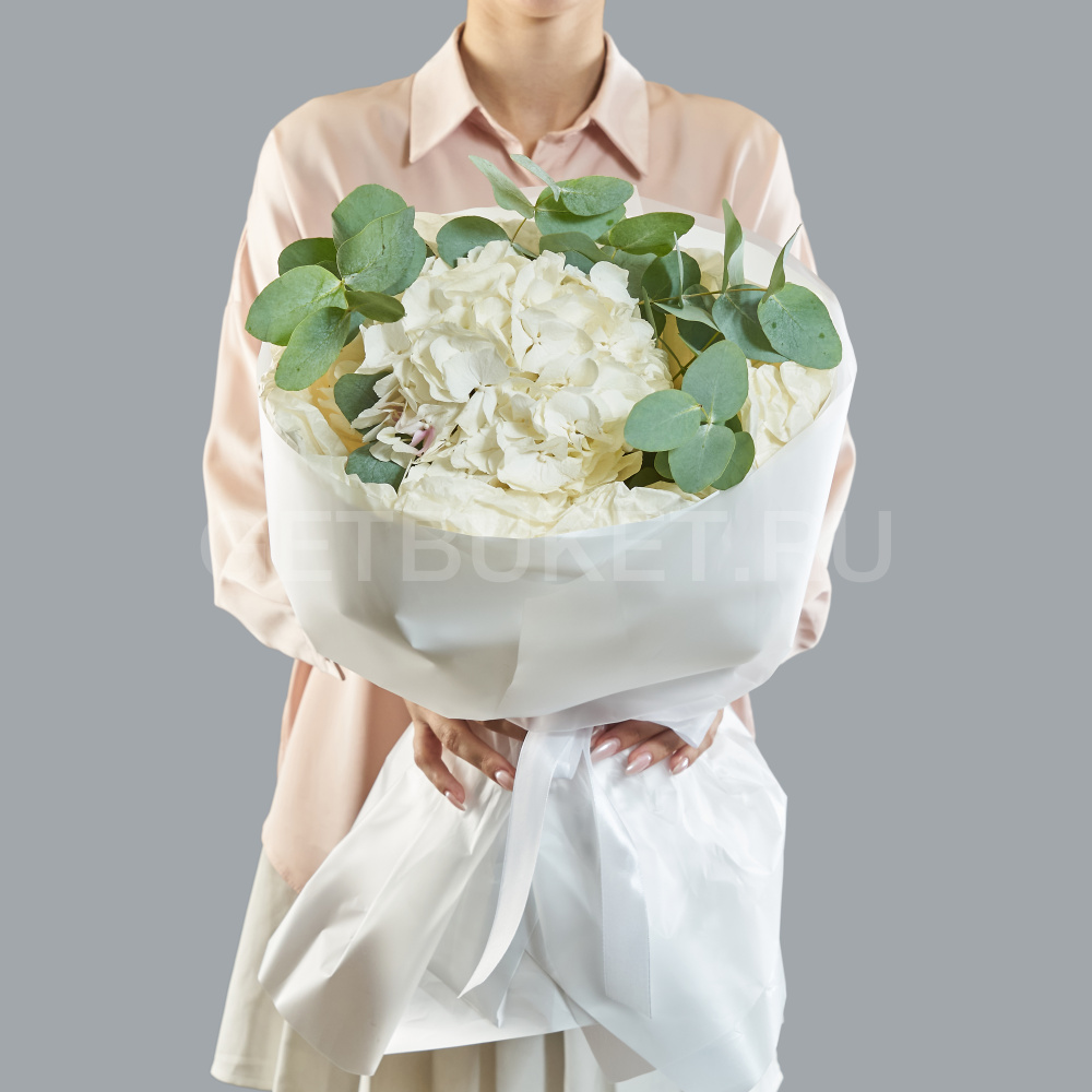 Букет из белой гортензии с эвкалиптом